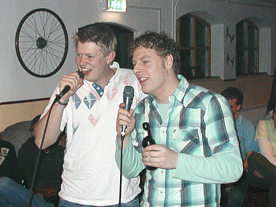 Het organisaasiej-trio -- De Pol, Zum Feldhaus en Da Vunzzz -- kondigen het hoofdprogramma voor de vrijdagavond aan: karaoke.